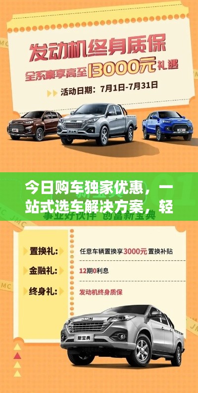了解最新的购车优惠信息对于想要购车的消费者来说非常重要,通过关注各大汽车品牌的官方网站、社交媒体平台以及汽车销售门店的促销活动,消费者可以获取最新的购车优惠资讯,在购车过程中,消费者还应该注意车辆性能、价格对比以及优惠细节等方面,以便选择适合自己的购车方案,希望本文能为您的购车之旅提供一站式解决方案,让您轻松选购心仪车辆。